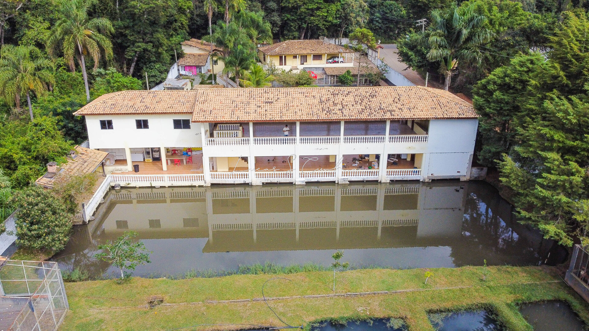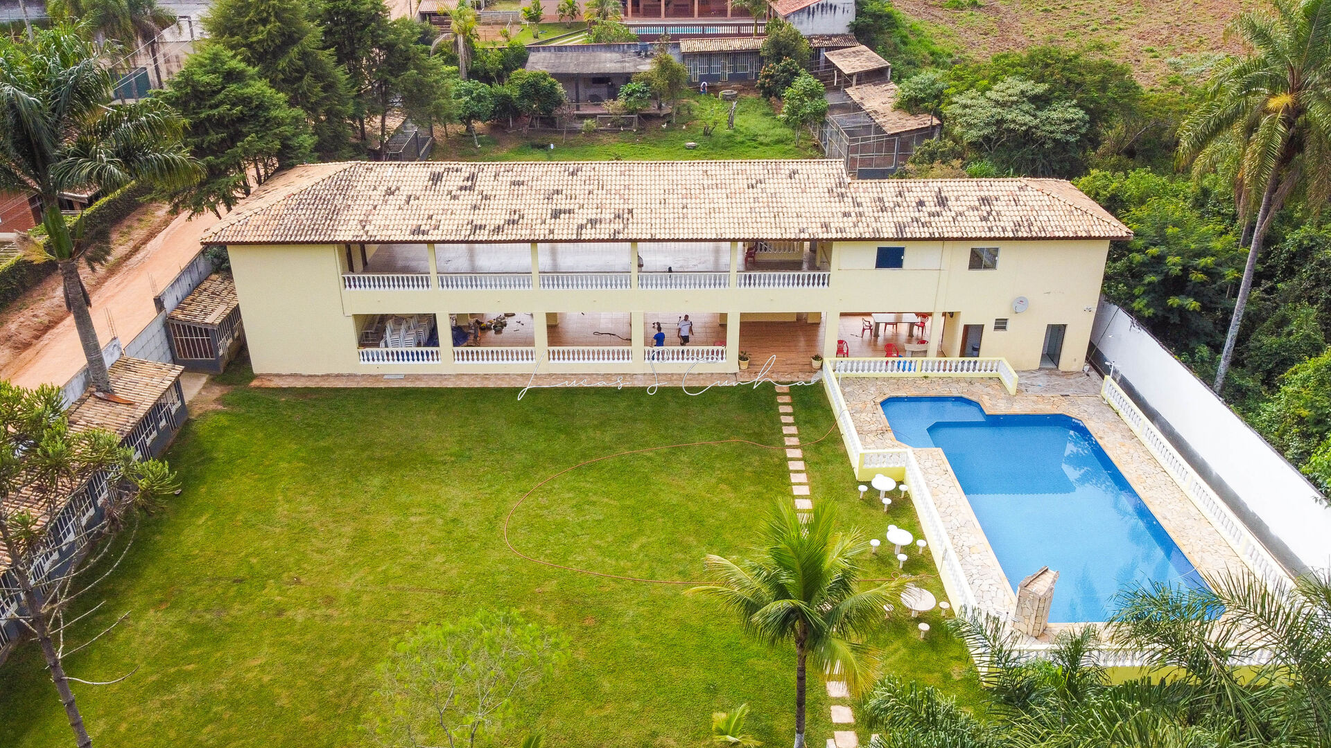 Outras características: Piscina 15x6 em vinil, com cascata Lago; Quarto de despejo